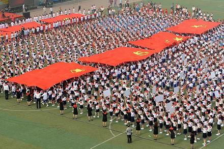2000余名小學(xué)生排成方陣進(jìn)行“紅色傳遞”,四面長(zhǎng)9米、寬6米的巨幅黨旗、國(guó)旗、團(tuán)旗、隊(duì)旗緩緩從頭頂劃過。