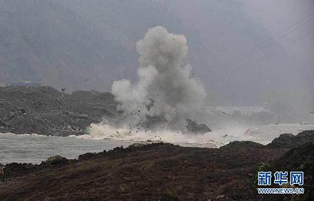 8月17日,第二次對巨石的爆破成功進行。當日,四川汶川縣映秀鎮對岷江紅椿溝段壅塞體進行了兩次爆破,使泄洪渠得到有效拓寬。據爆破現場負責人介紹,爆破主要是為消除8塊巨石,這些巨石超出了挖掘機的負荷量,必須選擇爆破方式解決。