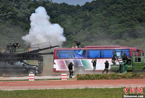 作為亞運安保主力的武警廣東總隊官兵,連日來在某訓(xùn)練基地進行演練。為應(yīng)對恐怖事件,該總隊強化了體能、攀登、擒敵、射擊、偵查、野外生存等訓(xùn)練,并邀請反恐專家研究處置策略和戰(zhàn)術(shù)手段。